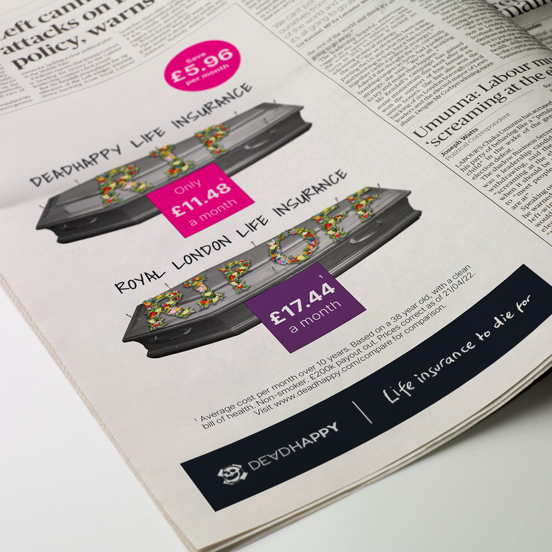 This campaign challenges the overpriced norms of traditional life insurance through humour, visual simplicity, and brutal honesty, while taking aim at one of the industry leaders (Royal London).